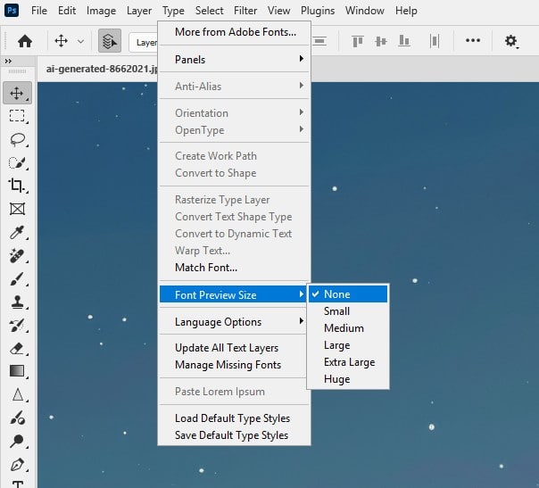 Too many active fonts can bog down Photoshop 2025, particularly with the new Dynamic Text feature. In Type > Font Preview Size, select None to disable previews and save resources.