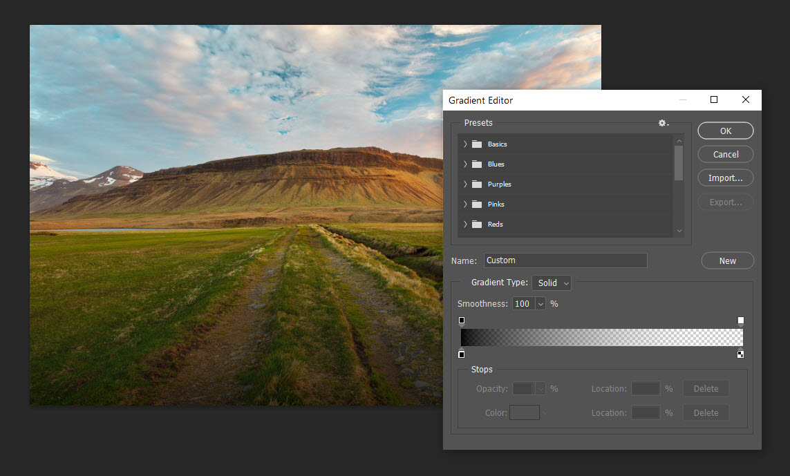 Load the sunset stock image into Photoshop – on the background layer, apply the following Gradient with the Gradient tool to slightly darken/fade the bottom portion of the photo: